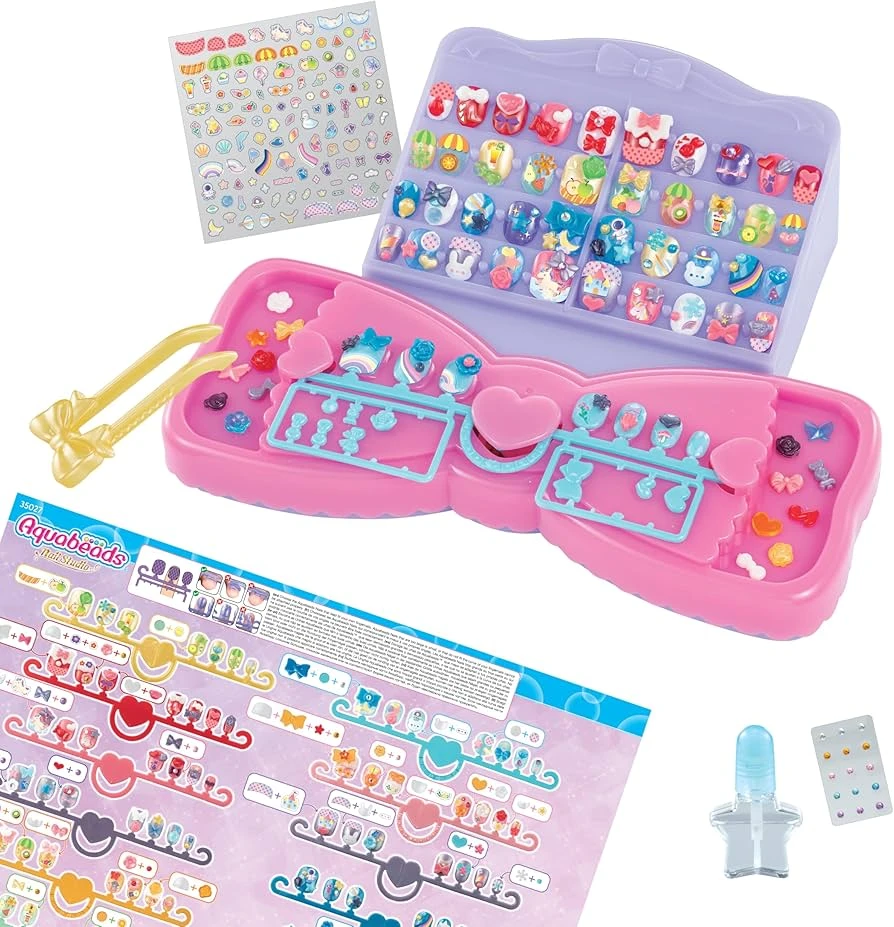 Let your little artists adorn their nails with shimmering designs using the Aquabeads Nail Studio Design & Display. This craft set includes Aquabeads nails, decorations, worktable, tweezers, water applicator, stickers, and a display stand to showcase their finished designs. With over 60 nail designs to choose from, kids can craft stunning Aquabeads nails using only tap water.