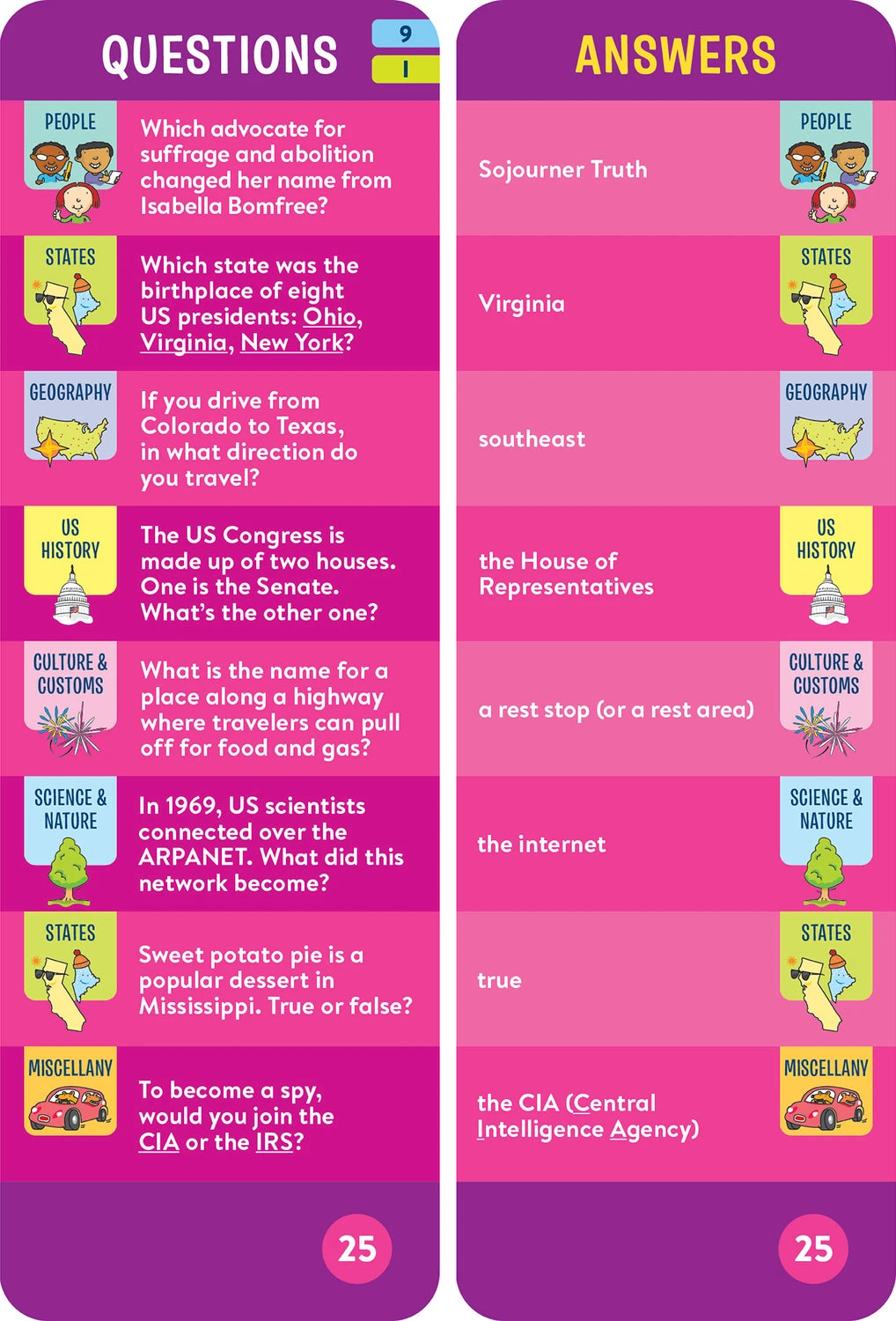 - 1,100 questions and answers covering U.S. History, Geography, states and capitals, famous Americans, culture and customs, science and nature, and more