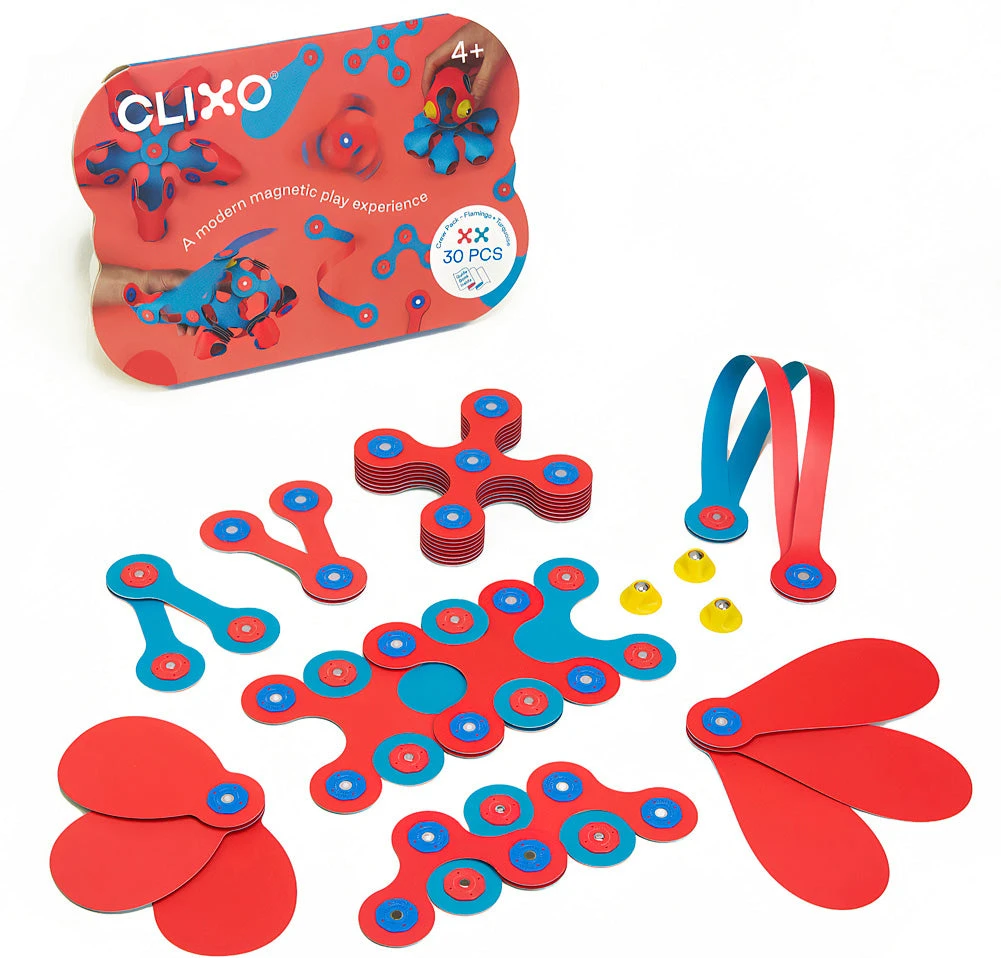 Click, snap, and stack your way to endless creations with 28 flamingo and turquoise colored lightweight pieces–from pinwheels to propellers–and two cool spinners.