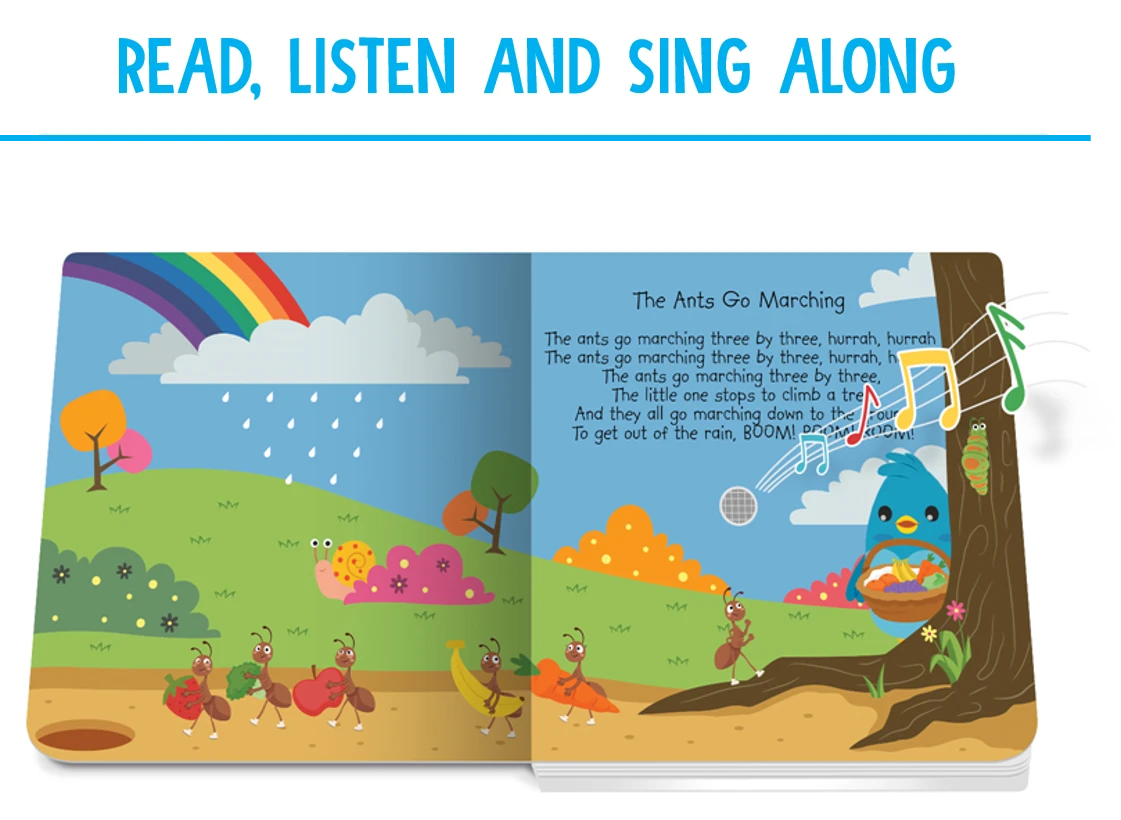 The electronic push summary on every spread triggers one of the six best-selling learning’s song, sung by children. The beautiful images will hold your baby’s attention even longer.