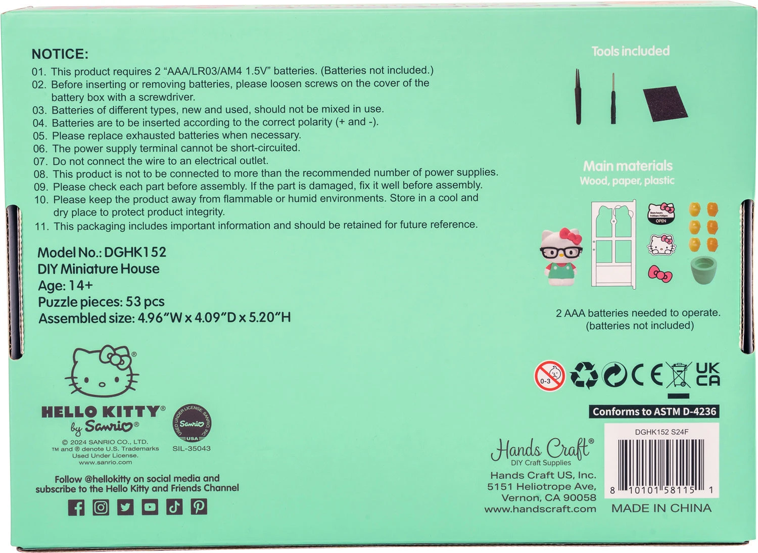 Introducing a satisfying new DIY activity for teens who enjoy focused crafting! Perfect for Hello Kitty fans and creative crafters, this kit provides hours of fun as you assemble this highly detailed miniature bookstore, filled with tiny books, adorable gifts, and colorful gift bags. Once completed, you’ll be enchanted by the cozy LED-lit interior and a cute, pint-sized, Hello Kitty figurine, ready for endless hours of play and imagination. A memorable gift that wows, and the finished piece makes a wonderful display for any bookshelf. Requires 2 AAA batteries, not included.