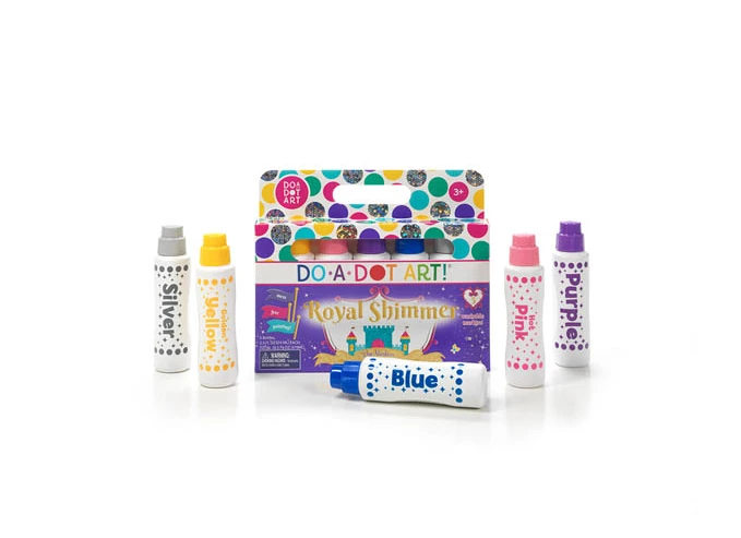 Add shimmer and shine to all of your art projects with Do A Dot Art! Royal Shimmer markers. Whether it’s a sparkling crown or a shimmering sword, this set of dot markers is sure to dazzle up any art activity. Do A Dot Art! markers are washable and super easy to use, with no cups, no brush, no mess, parents and teachers can rest easy knowing their kids can have a blast creating fun art without all of the mess! The water based ink dries quickly and allows kids to mix, blend, and layer colors. Just twist off the cap and let these shimmer markers shine!