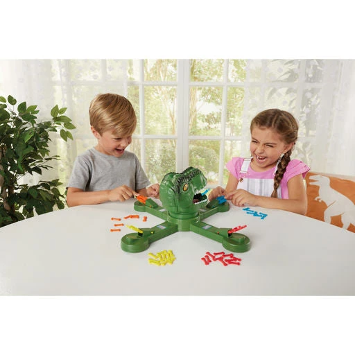 Cue the Jurassic Park theme song and discover new worlds of fun with this fast-play tabletop action game! Each player picks a color and prepares their 10 bones. As the T-Rex spins around, his jaws open and close. Players use launch pads to toss him bone treats to eat! Be quick – the first player to land all their bones into the dino’s mouth wins. If you miss, pick up your bones and try again. Great for the whole family! Includes game base, 40 colorful bones (10 of each color), and instructions. For 2-4 players. Requires 3 AA batteries, not included.