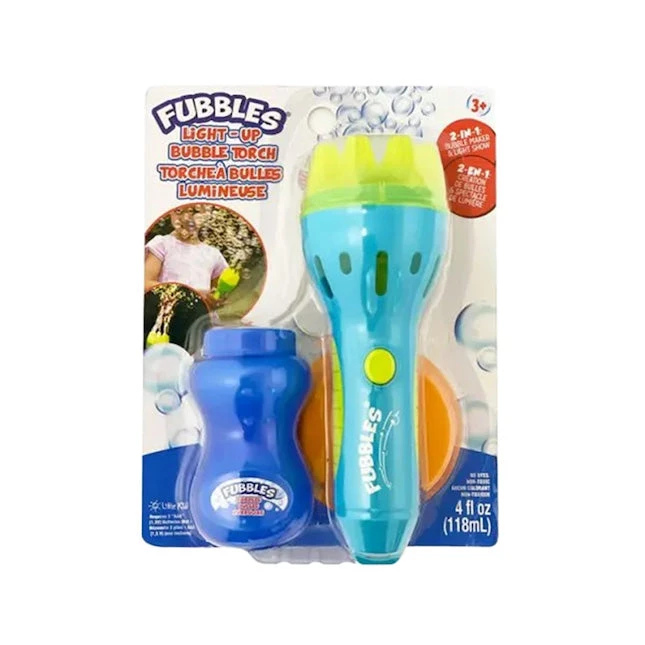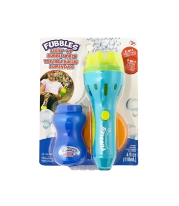 The fan inside blows a constant stream of bubbles for a nighttime lights show! Combine outdoor play with cause and effect learning that sparks imaginations. Includes bubble torch and 4 fl oz of bubble solution. Requires 3 AAA batteries, not included.