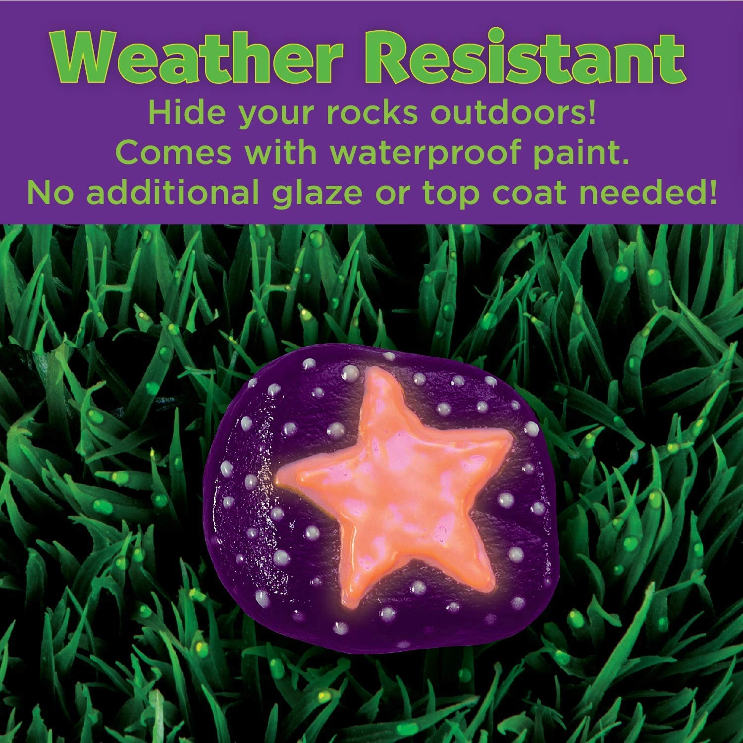 One glowing rock at a time your kit includes 10 natural river rocks, water-resistant fluorescent paint, dimensional glow-in-the-dark paint and 2 paint brushes. Hide these rocks in the dark and watch them glow! Both rock painters and Finders are encouraged to share pictures of their rocks on our facebook and Instagram pages, so be sure to add the waterproof “#Creativity for Kids” tracking sticker to the bottom of your rocks