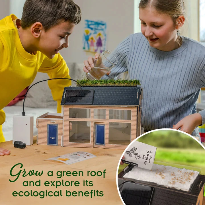 The future of energy engineering begins at home. With this kit, kids can construct and experiment with a model house that demonstrates various aspects of renewable energy and green home design.