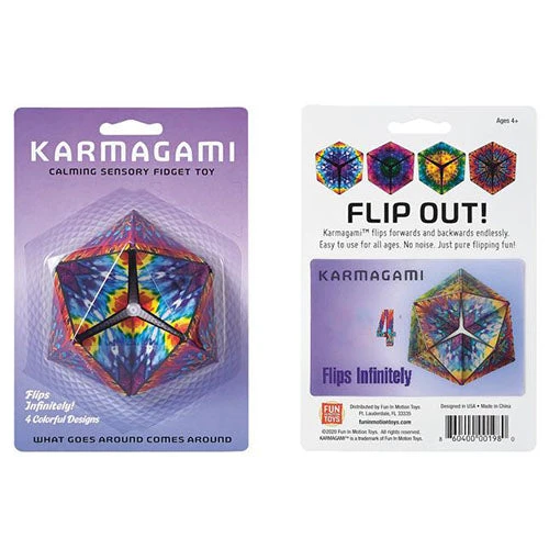 Karmagami flips infinitely – rotating and transforming seamlessly into 4 colorful designs like a kaleidoscope. It helps calm the mind and is great for kids and adults who constantly fidget with their hands. Anyone can flip it forwards and backwards endlessly. It’s easy to use for all ages! No noise. No gimmicks. Just pure flipping fun!