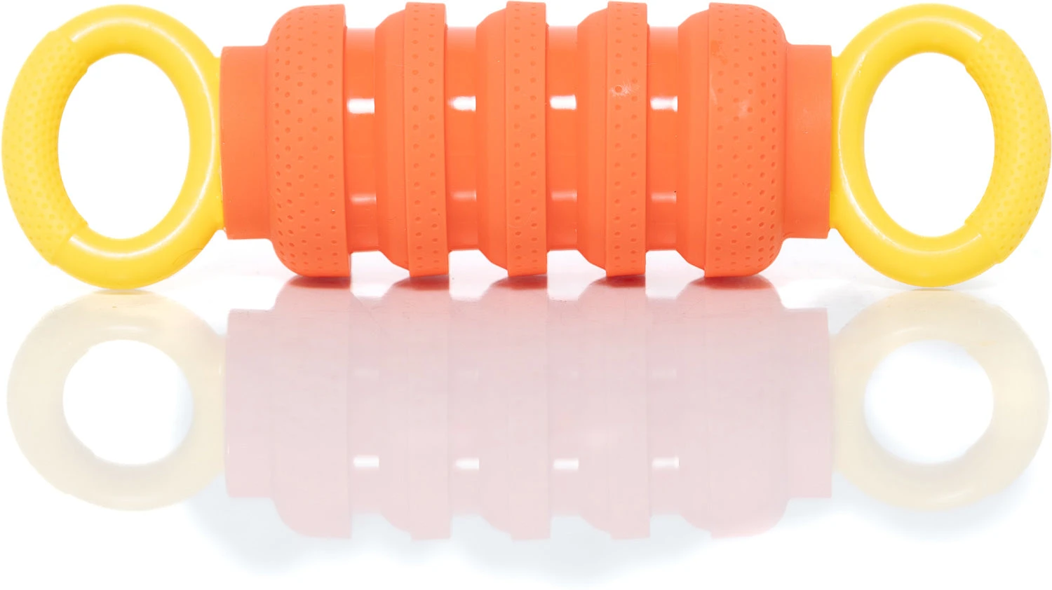 A brand new fidget for babies that’s so fun adults will want to play too! Discover a delightful crumple sound as this clever plaything is pulled apart and squished together. The food-grade silicone is safe for teething, and easy-grip handles and textured surfaces make Krumples Pully extra irresistible. This take-anywhere cause and effect toy is 7″ closed, 9″ open, and best of all… dishwasher safe! Available in 6 fun color combinations. Styles and selection may vary. Each sold separately.