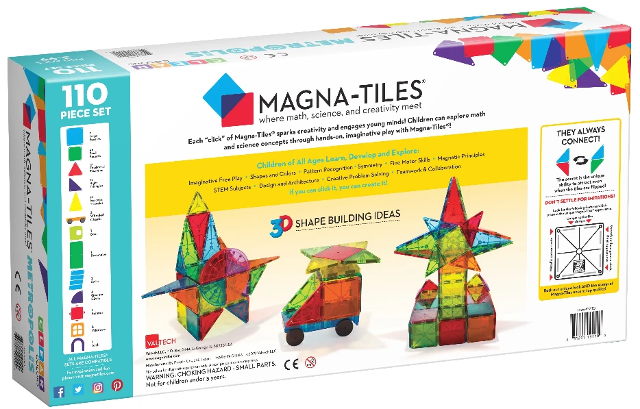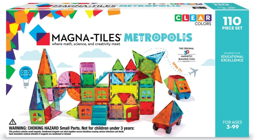 Magna-Tiles Metropolis is the next generation in the award-winning Magna-Tiles series containing 110 neon pieces. Included is a spinner, windows, quarter circles, and more to take your imagination to the big screen. From a busy high-rise metropolis to a thriving colony on space, there’s no stopping your imagination with this new set!