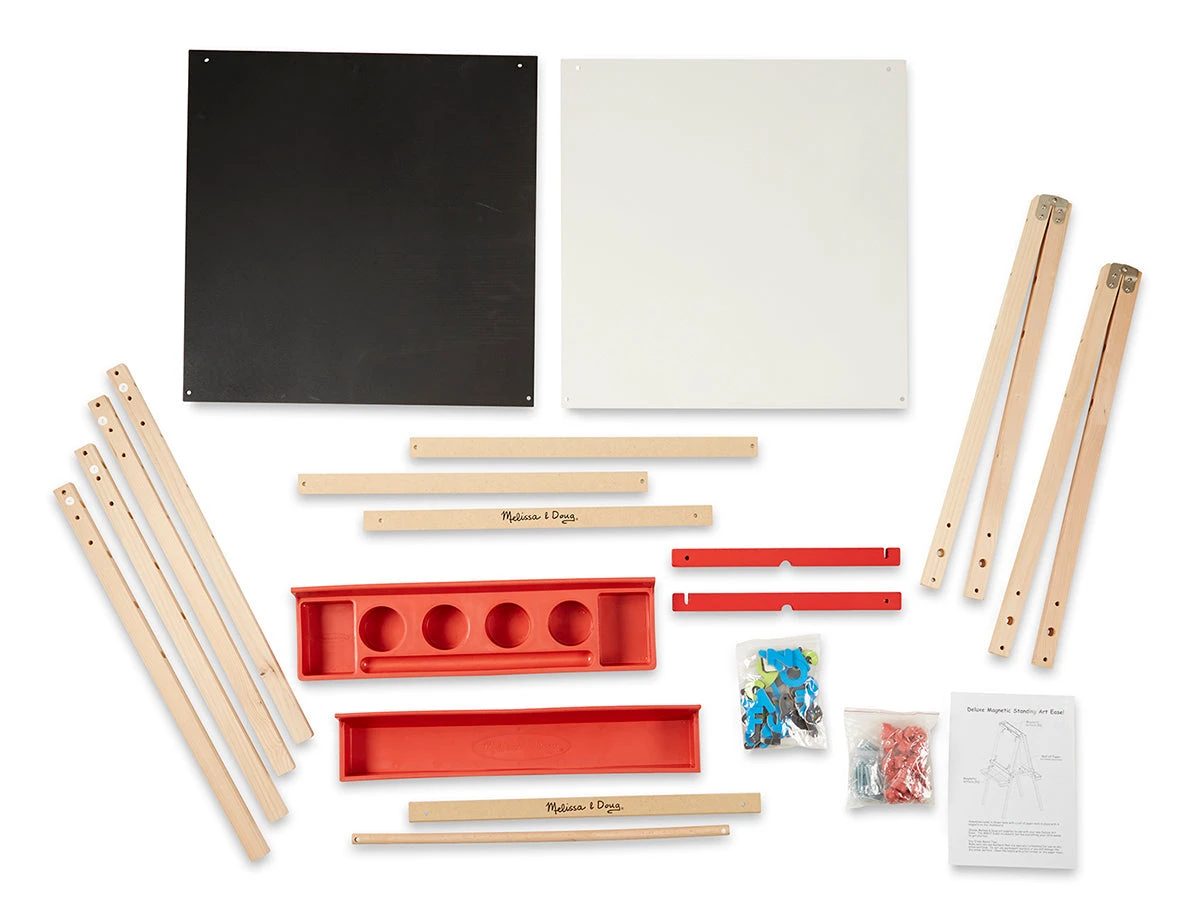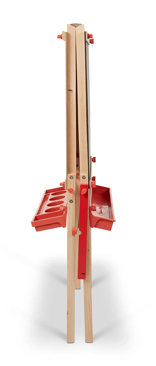 Help spark creative expression in your budding artist with this generously sized, deluxe wooden easel featuring both a magnetic chalkboard and a dry-erase board. The removable plastic trays mean that kids have loads of easy-reach art supplies (not included) at their fingertips. Plus 39 letter and number magnets that are great for extended play! Please note: this easel can hold either an 18″ wide or 12″ wide paper roll (not included).