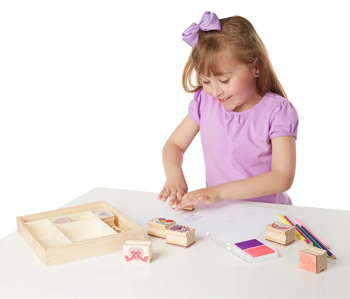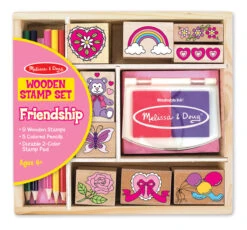 Featuring a rainbow, hearts, and more, children love using 8 playful stamps and a two-color inkpad. It’s fun creating countless scenes and coloring in the pictures with the 5 colored pencils! This well-crafted set is conveniently contained in a sturdy wooden box for organizing and storage. It’s a tremendous value that children will use over and over again! Washable, non-toxic kid-friendly ink.