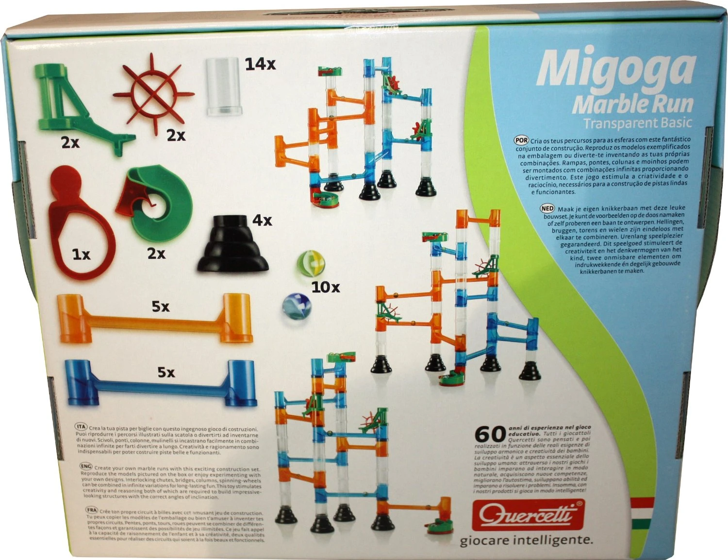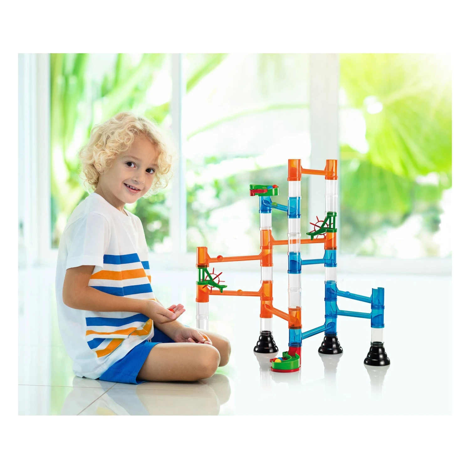 - Transparent tubes allow your child to watch the marbles go round and round.