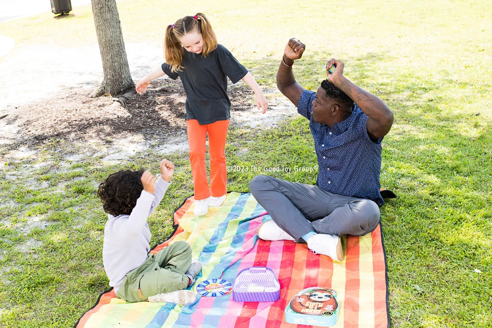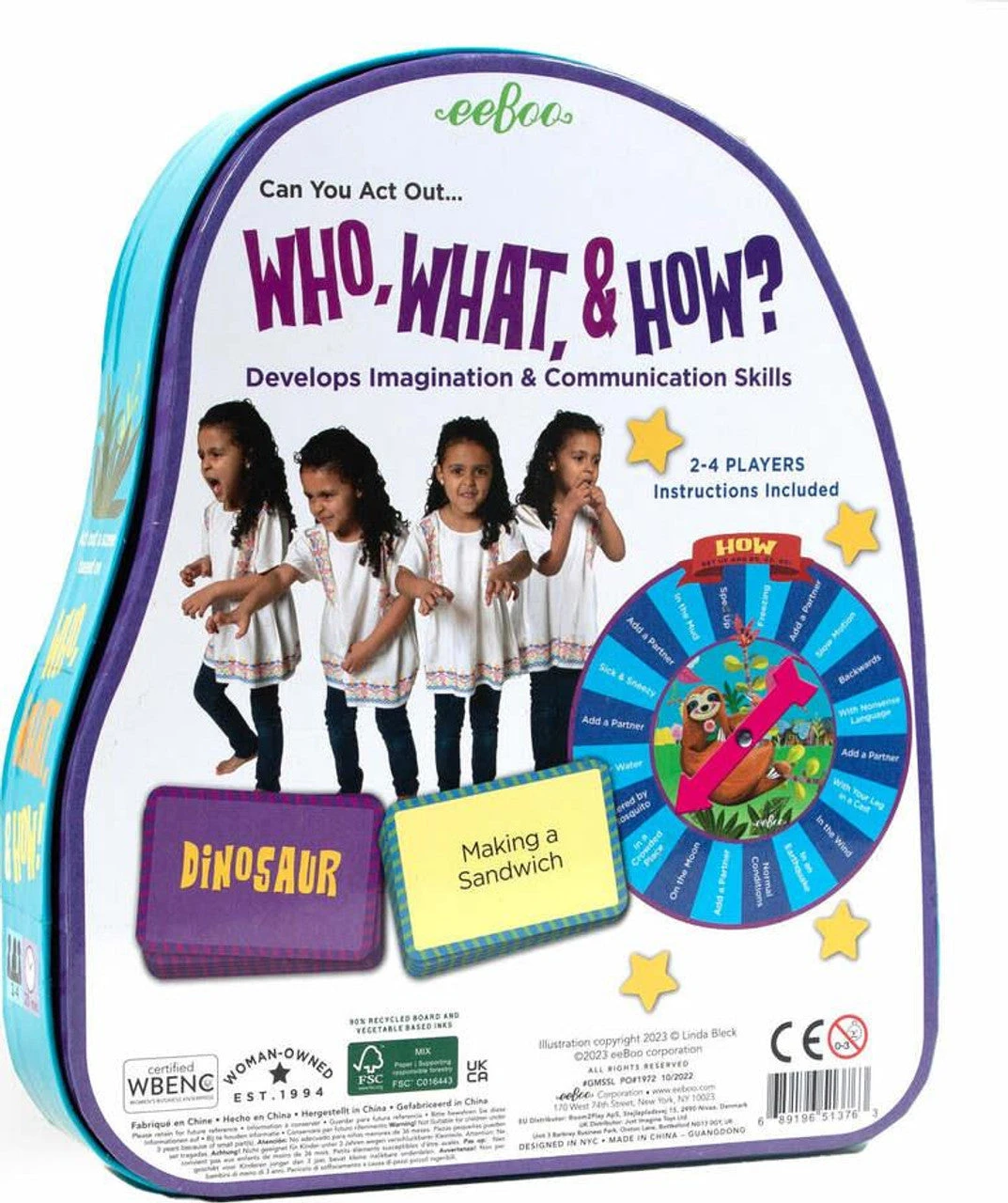 A fast-moving improv game for all ages that combines imagination and a little silliness. A player draws a WHO card, a WHAT card, then spins for HOW, and briefly acts out the combination. Sometimes challenging, always a lot of fun. Develops creativity and imagination.