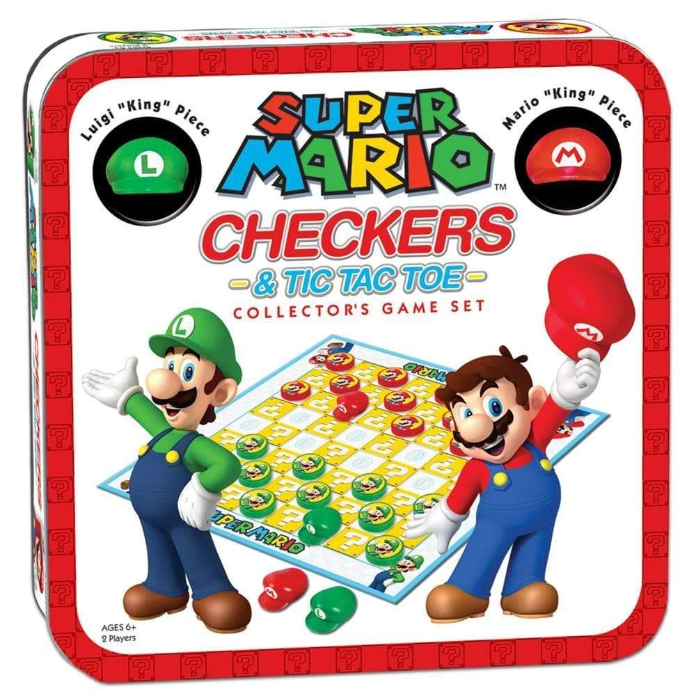 Packaged in a collectible tin, the Super Mario Checkers/Tic Tac Toe Collector’s Game Set plays like traditional Checkers and Tic Tac Toe with custom Mario and Luigi checker pieces and their hats for “Kinging”.