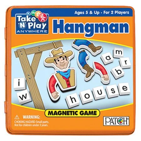 Take ‘N Play Anywhere games feature big playing pieces that are easy for kids to use and hard for kids to lose– the playing surface is printed inside a tin case and each of the pieces are magnetic! Its small size (6-3/4 inches square) makes it convenient to tuck into bags and take along when out and about. In this game, both the letters and the body parts are magnetic allowing you to play the classic game anywhere. Complete package contents include one magnetic game board, sixty-two letter magnets, eight blank magnets, six Hangman body parts, two scoring markers, and rules. For 2 players. Recommended for ages 5 and up. WARNING-CHOKING HAZARD-Small parts. Not for children under 3 years. Imported.
