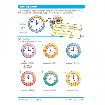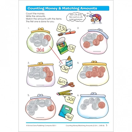 Does you child know how many dimes make a dollar? You can count on this workbook to cover coin values and other skills pertaining to money. You can also count on being surprised at how much your child will learn about time and fractions in this lively, 64-page skill-building workbook. The skills typically taught in Grades 1 and 2 are right here: counting and comparing amounts of money to 99 cents, telling time by the hour, half hour, and quarter hour, plus identifying halves, thirds, and fourths of regions and groups… and more.