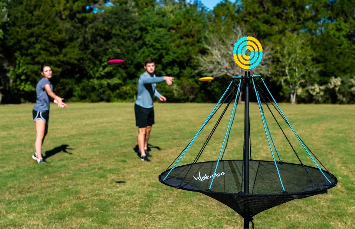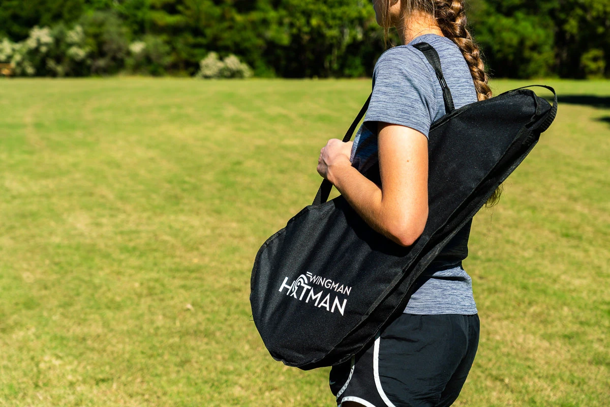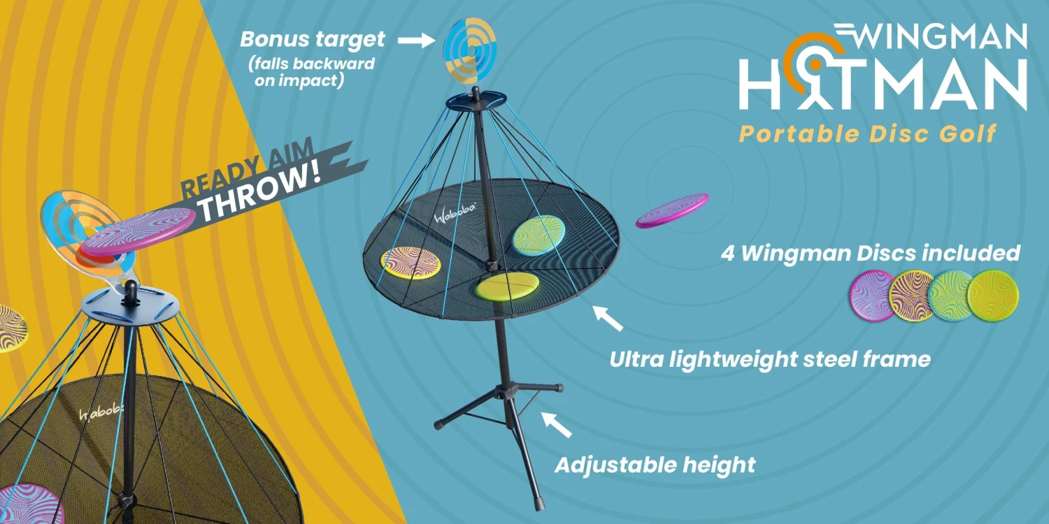 Hit it, man! The Wingman Hitman features 2 disc targets in 1! Aim for the cage, or hit the bullseye topper for an added challenge – falls backwards on impact. The Hitman is super lightweight and packs small for more ways to play disc golf with your Wingman anywhere.