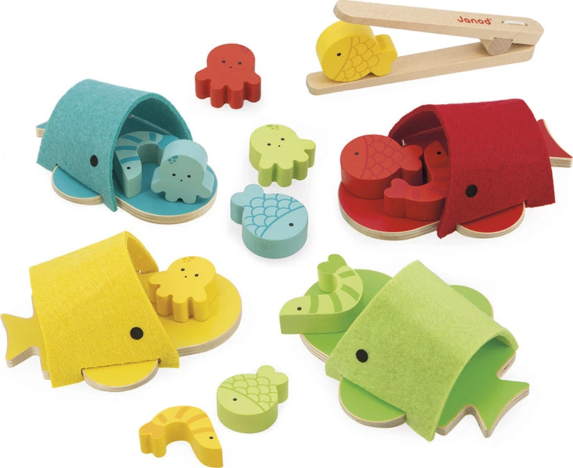 From blues to reds to yellows, there are so many colors to discover! Your child will need to use the wooden tweezers to put the whales and sea-life into color-coded categories. This fun, educational game will let your child learn about shapes and colors at the same time as developing their fine motor skills. Toy made of FSCTM-certified wood.