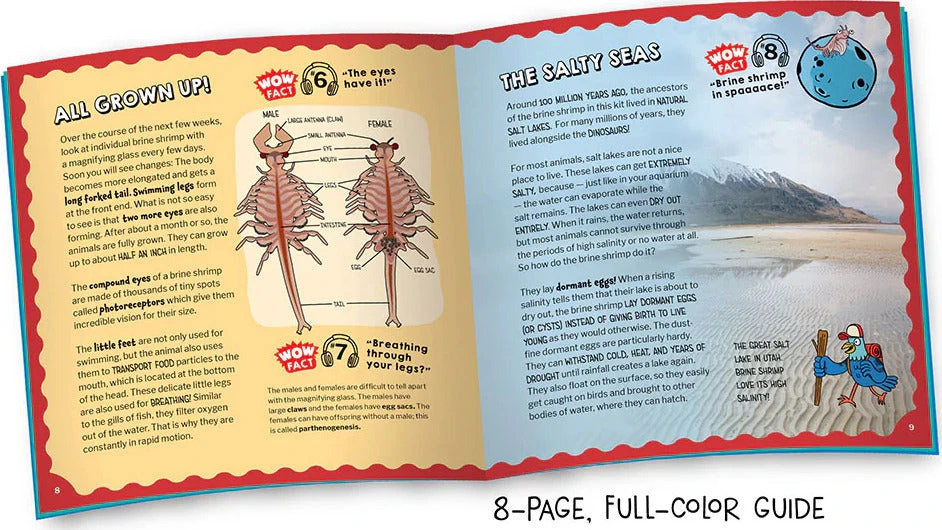 When properly cared for, the brine shrimp can live for months and even years, and the durable habitat tank can be used for bugs and other things afterward. Customize the tank with the included sea life stickers. The exclusive Wow in the World podcast content (accessed via a QR code in the guide) enhances the fun and learning. The kit also includes a magnifying glass to add to your collection of classic STEM tools.